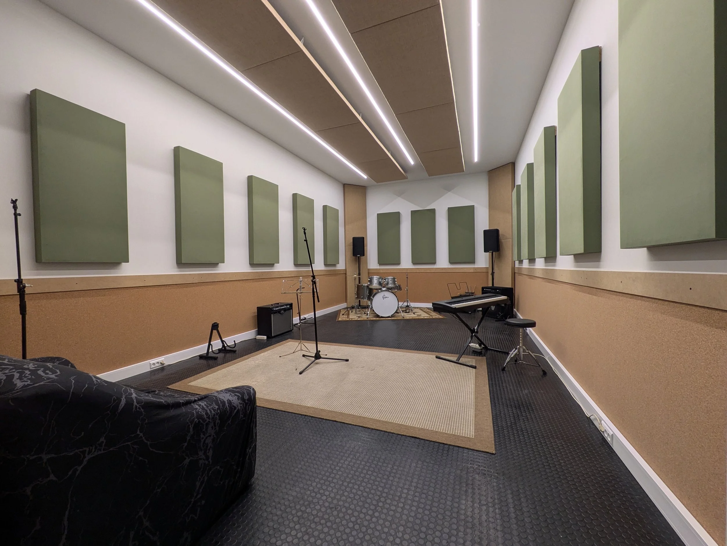 The GREEN ROOM (E2) is one of our big rehearsal rooms and can accommodate up to 10-12 musicians comfortably.