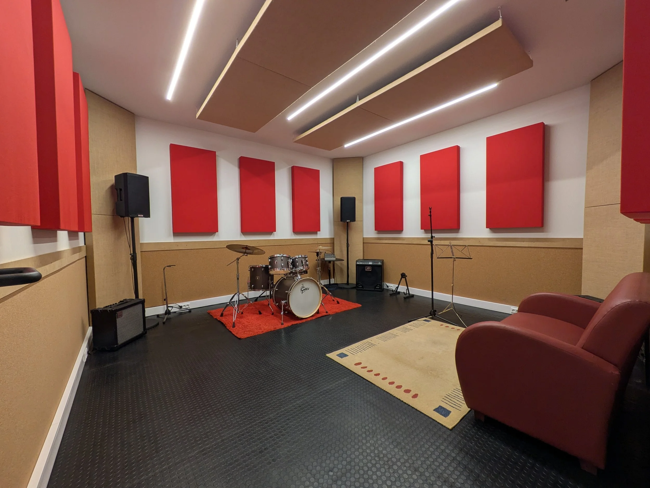 The RED ROOM (E5) is one of our STANDARD rooms and is designed to fit 4-6 people comfortably for a professional rehearsal experience. It’s perfect for most 4/5/6-piece bands but also great for smaller projects like Duos and Trios.